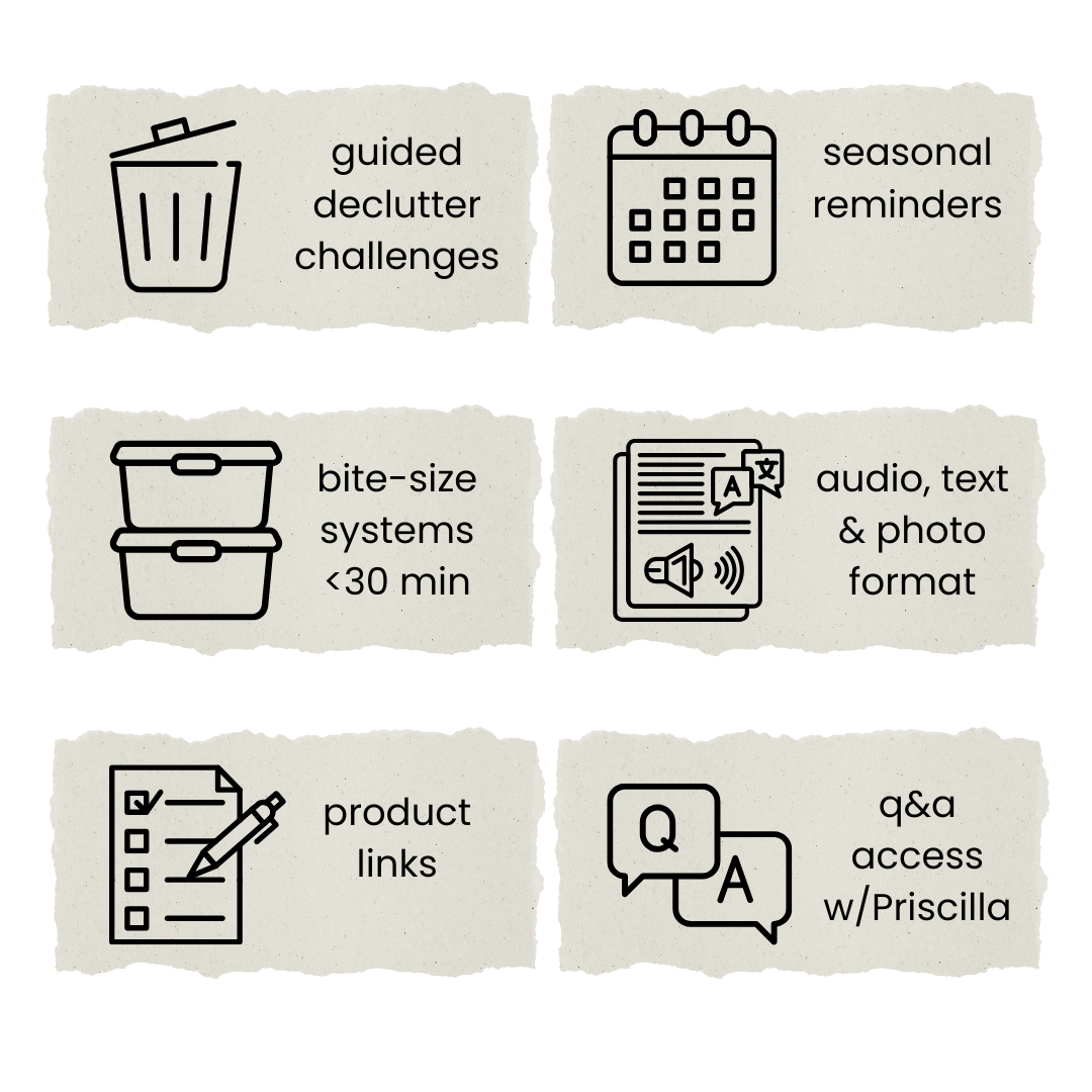 Together we'll chip away at the overwhelm with guided, doable and maintainable methods for organizing your home, custom to your family's needs.